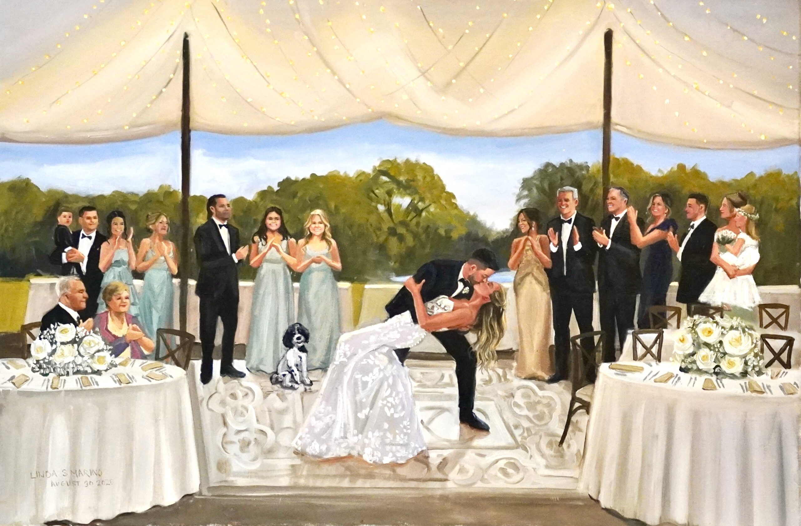 Adam and Molly were wonderful collaborators. They shared photos of their dog, Cannoli, who they wanted included in the painting, along with family members and their wedding party. They even sent me a video of themselves practicing their first dance—they had taken dance lessons together, which made the dip feel both natural and confident.