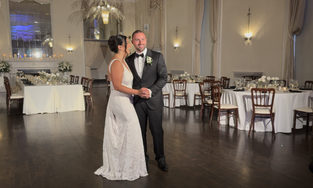 Their reception was filled with energy. The ballroom glowed in soft gold light, the chandeliers reflecting off the polished floors, white florals lining the tables. Family and friends were joyful and fully present, celebrating the beginning of a new chapter.