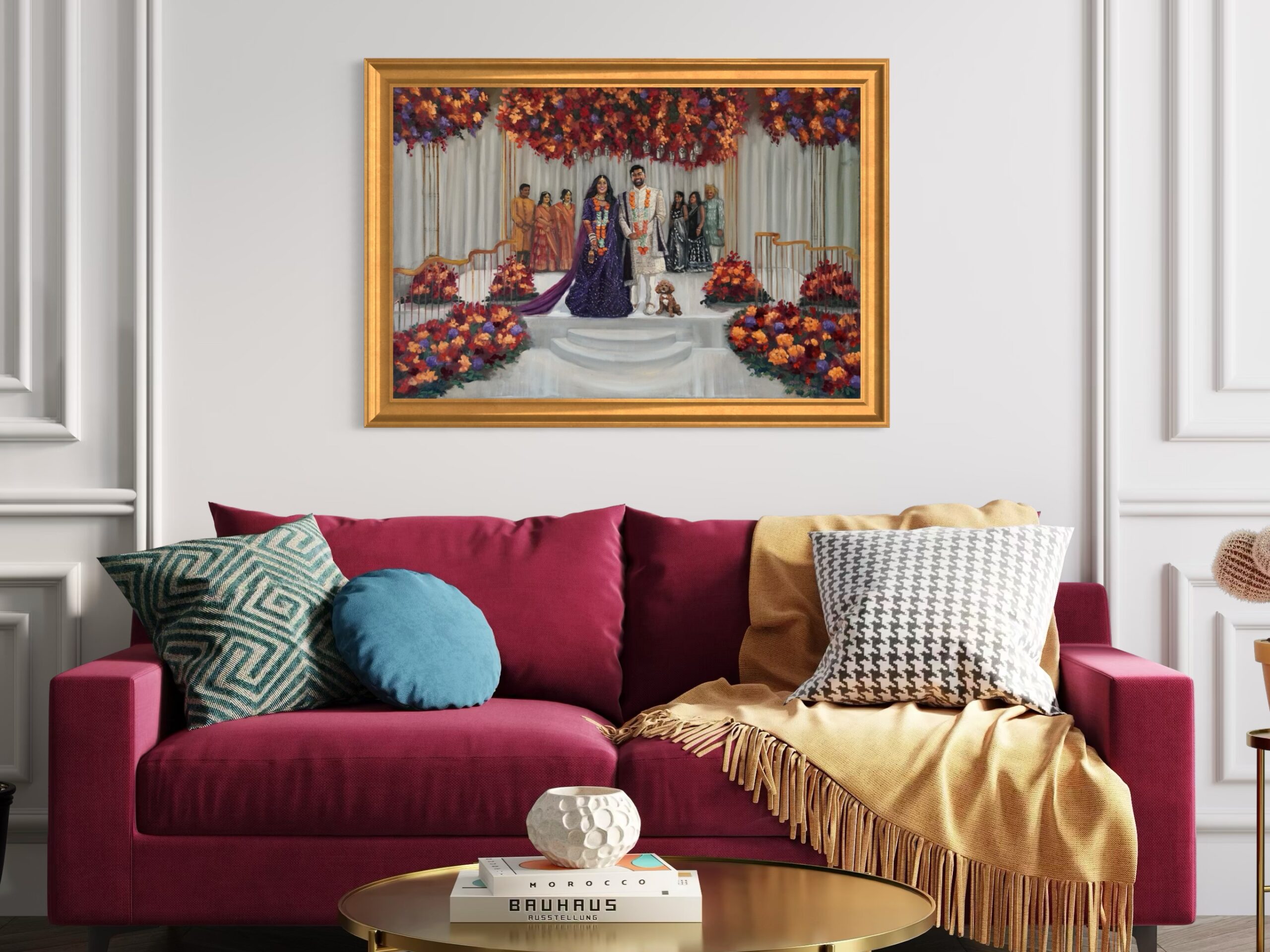 Before the wedding, Aarohi quietly sent me photographs of their beloved dog. She asked if I could include her in the painting as a gift for Aditya. I positioned their sweet little pup right beside them, as though she had been part of the ceremony all along.