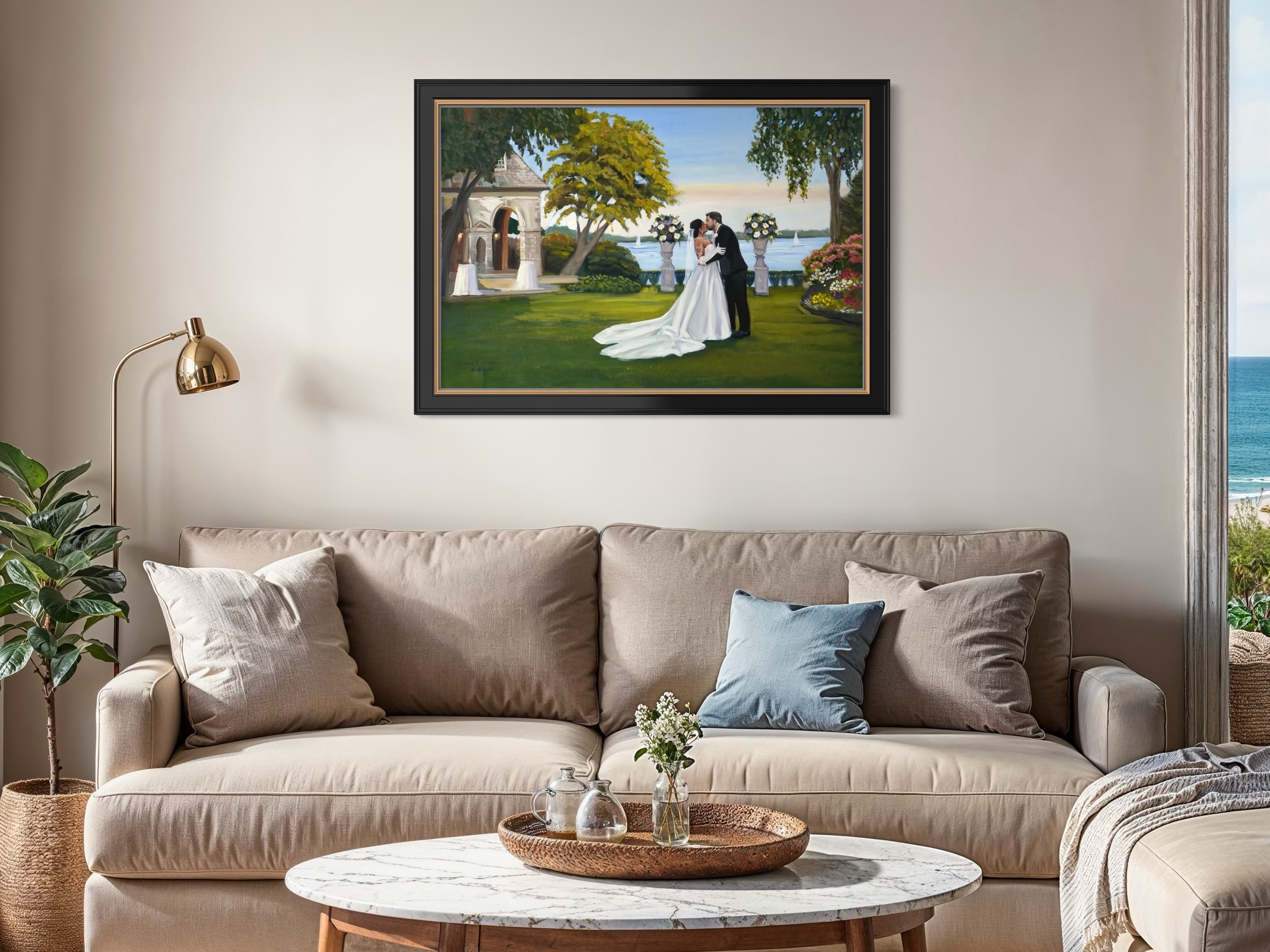 Because I’ve trained on large canvases outdoors, I was comfortable managing all those elements at once — architecture, landscaping, figures, florals, water, sky — without losing the intimacy of the couple.